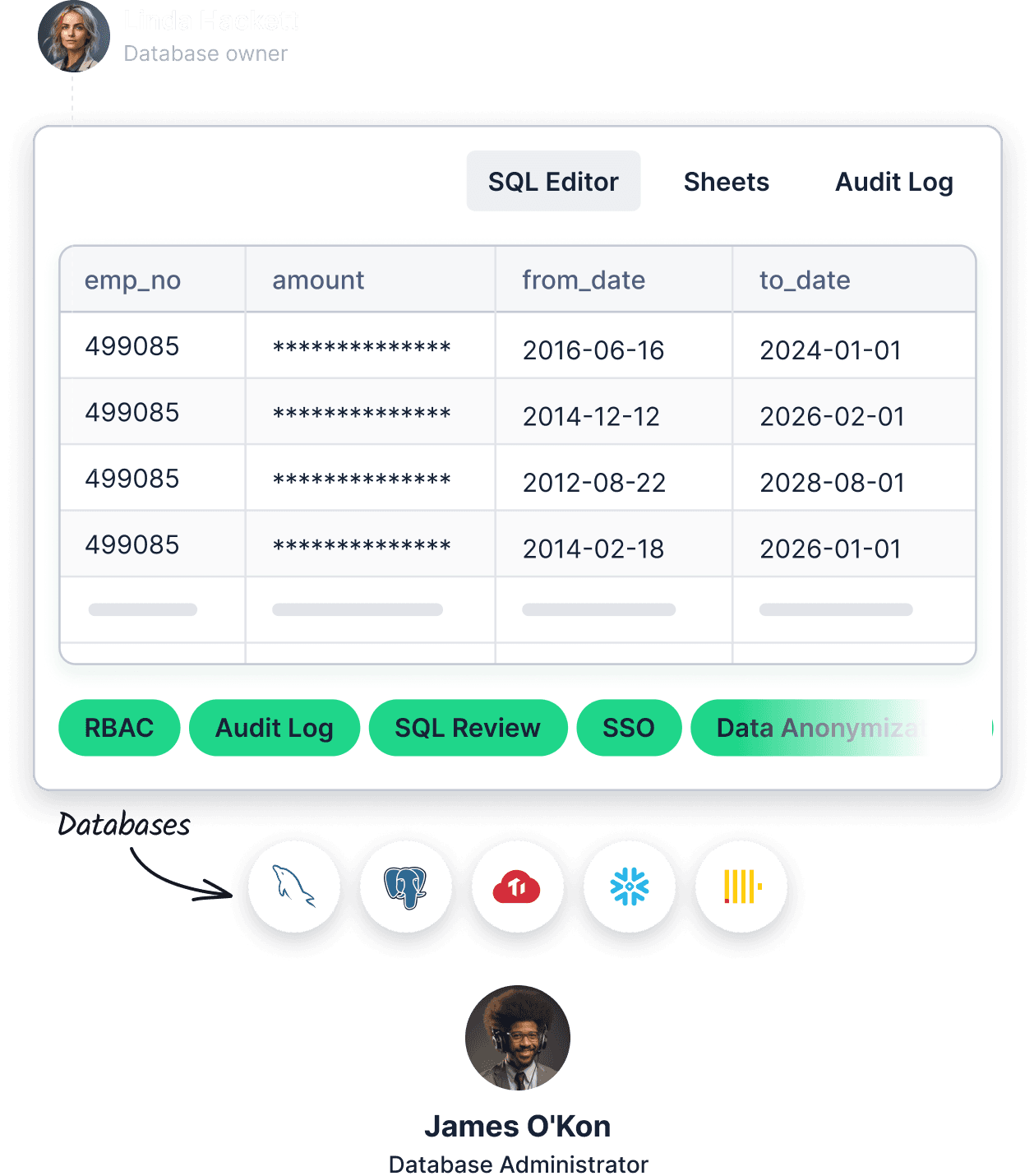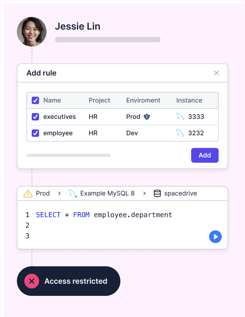 Just-in-Time (JIT) IAM-based database permissions with approval flow and audit logging.