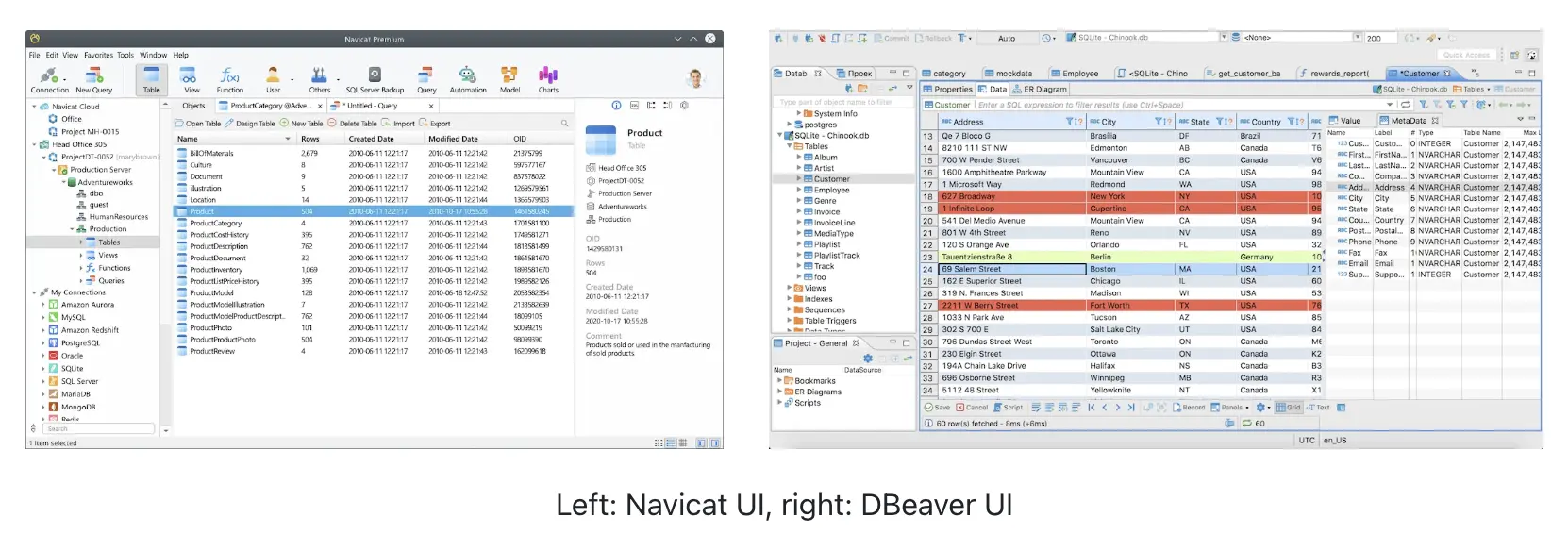 The difference between Navicat and DBeaver lies in their target audience and pricing models: Navicat is designed for commercial users and enterprises (yet they don't provide sufficient data access control, data masking, or centralised control over password for database security), while DBeaver is an open-source tool that caters to a wider range of users, from individual developers to SMEs. This difference is also visible in that Navicat uses a commercial licensing model, while DBeaver has both open-source (free) and commercial products.